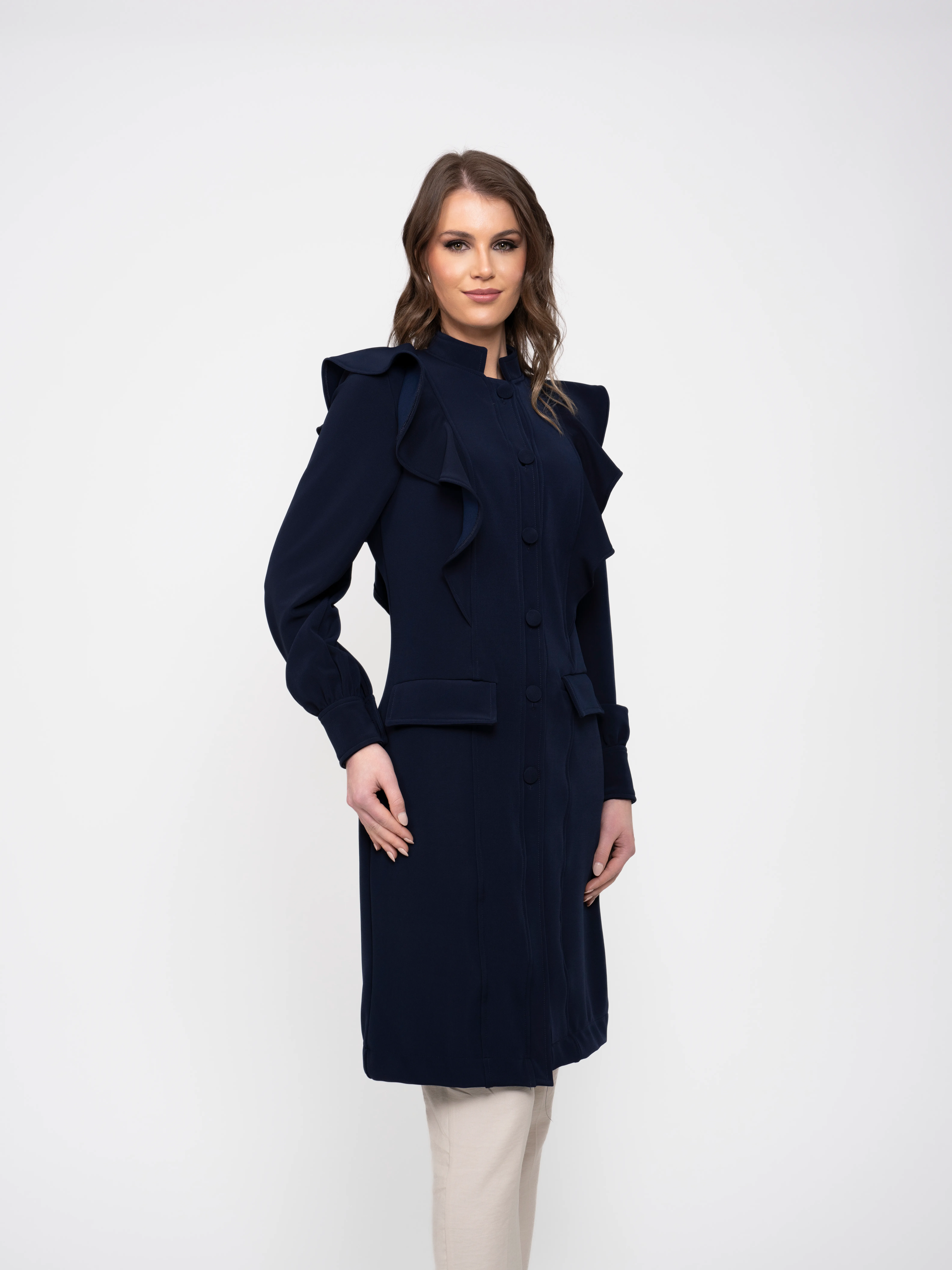 - Silhueta: O jaleco possui uma silhueta acinturada, que realça a forma do corpo, oferecendo um caimento elegante.