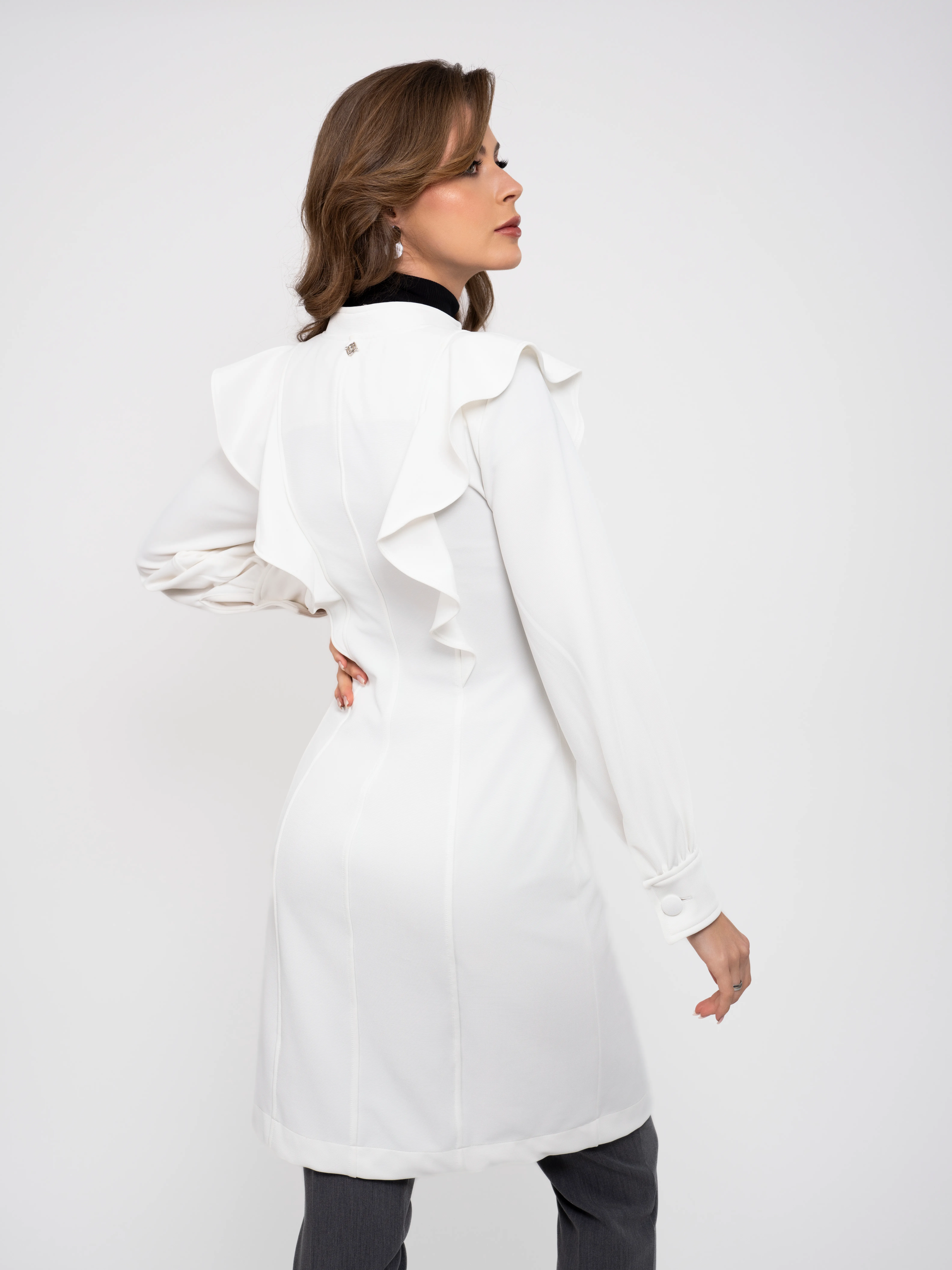 - Mangas: As mangas do jaleco são longas, mas o destaque fica por conta dos detalhes volumosos e estruturados nos ombros, que trazem um ar de sofisticação e originalidade ao modelo.