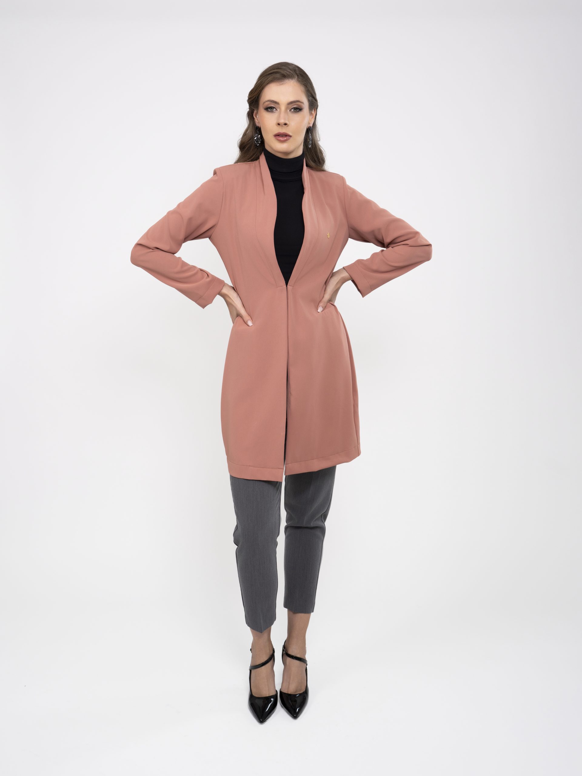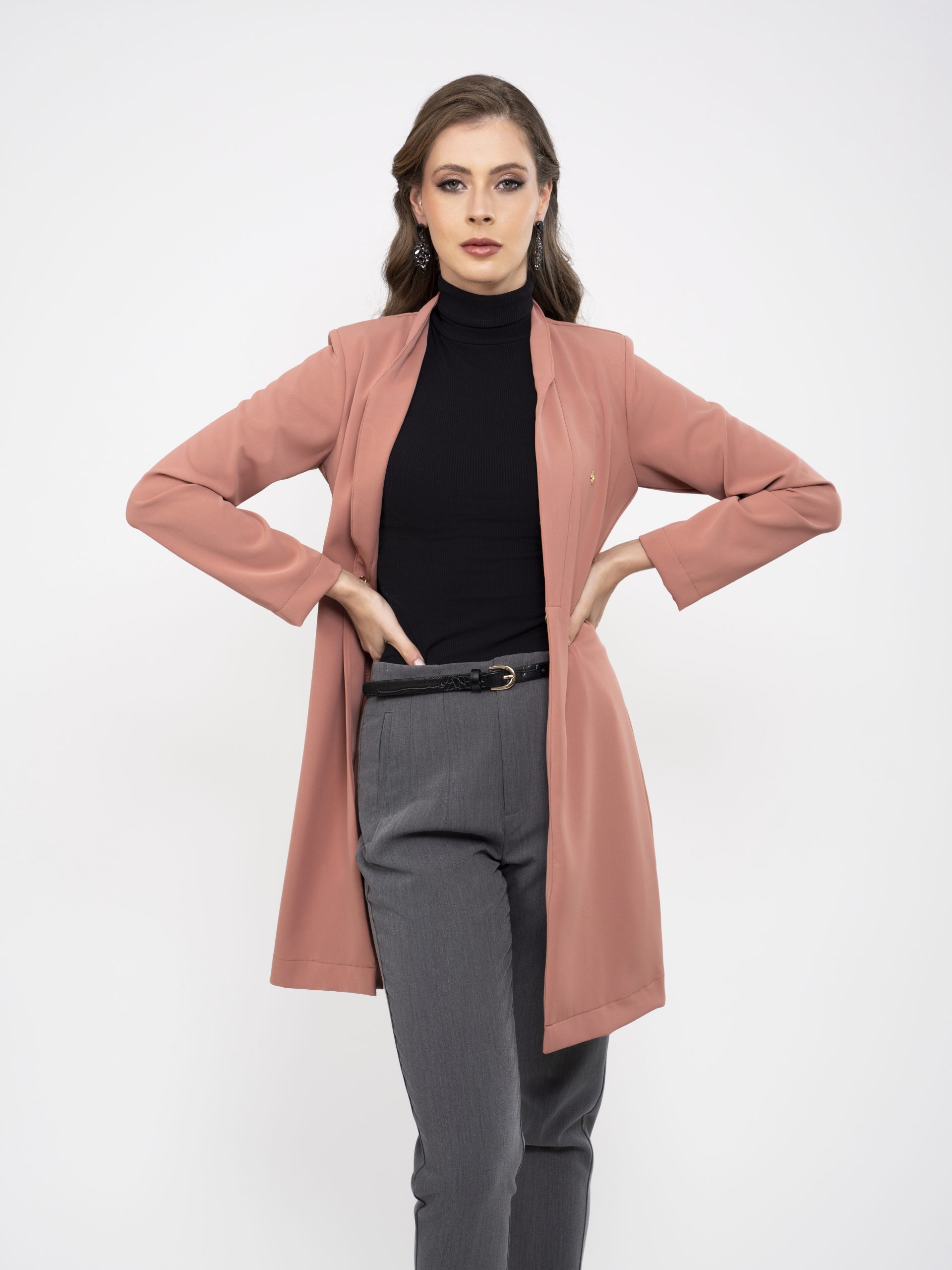 - Fechamento: O jaleco possui uma abertura que se estende desde o colarinho até a bainha, criando uma linha visual que alonga a silhueta, com fecho único frontal.
