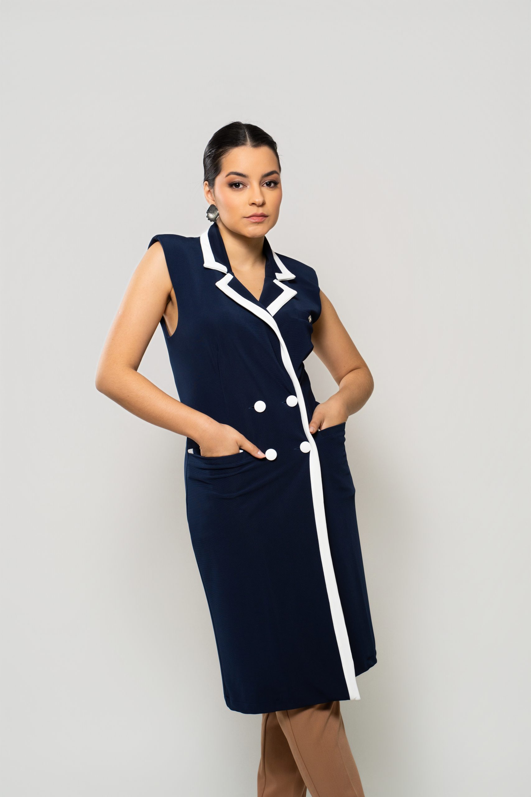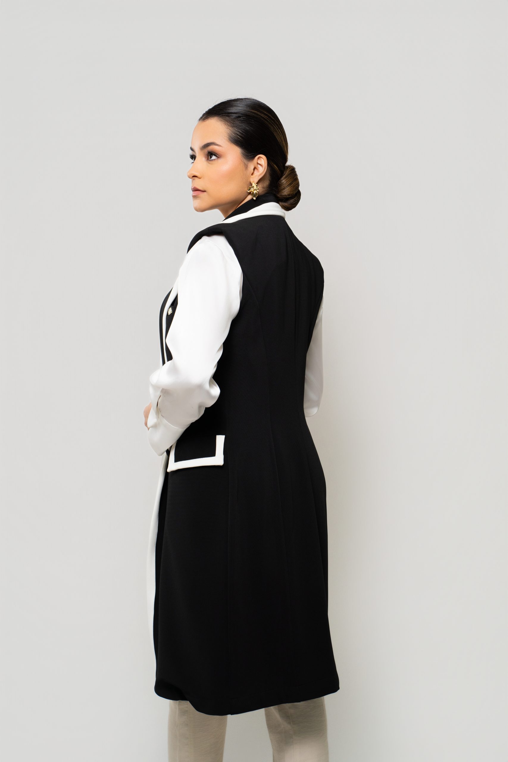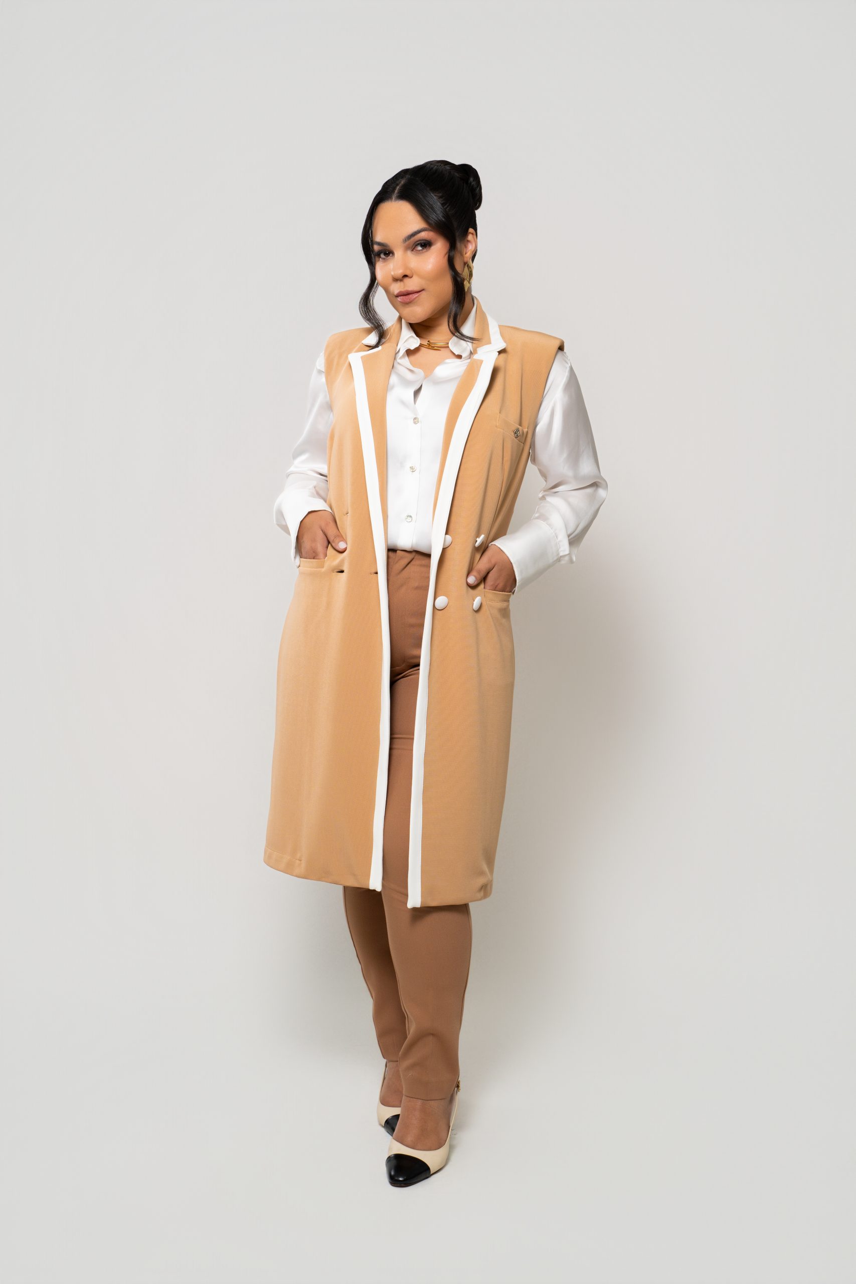 - Silhueta: Levemente acinturada e com comprimento alongado, valoriza a forma do corpo e transmite uma imagem polida e profissional.