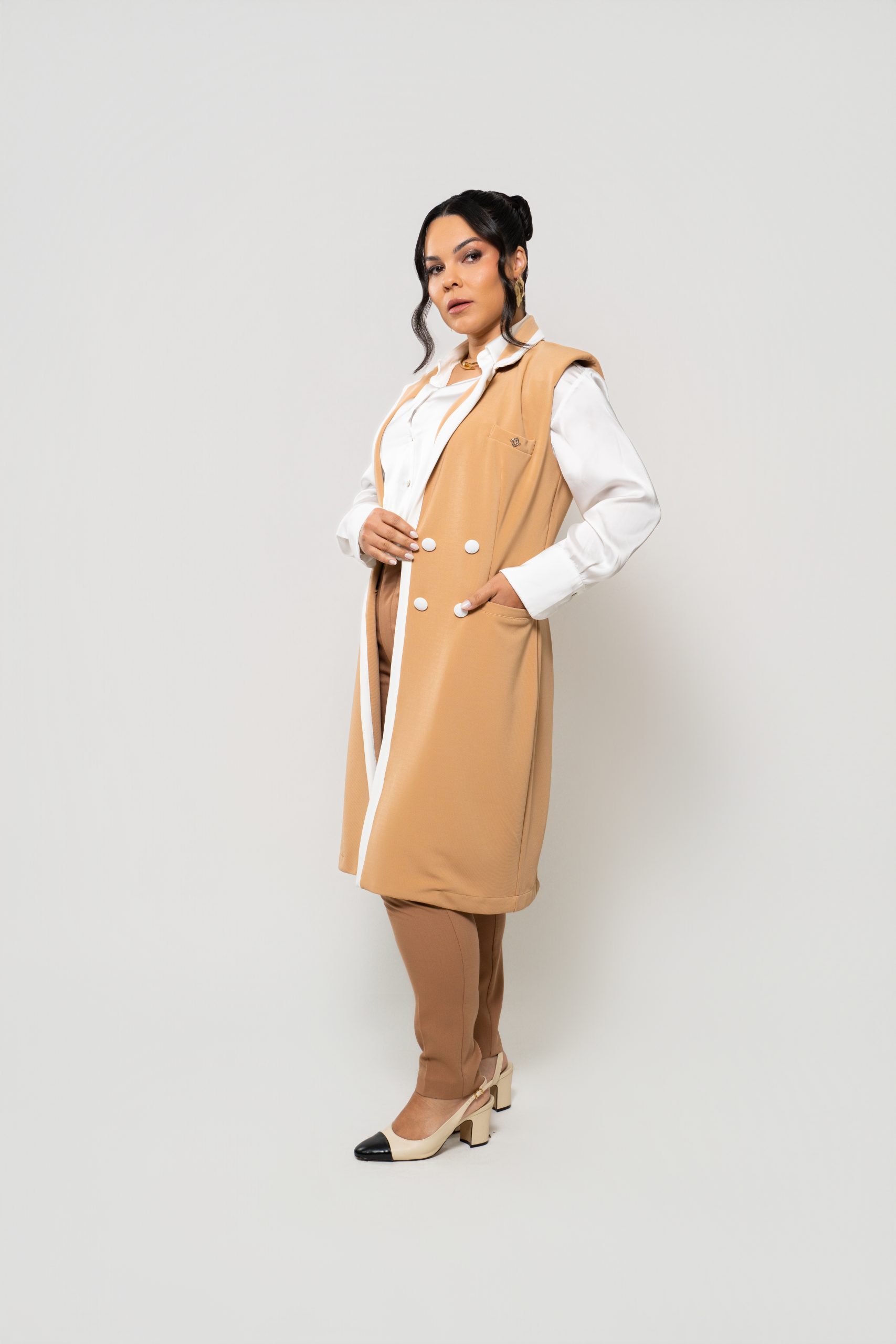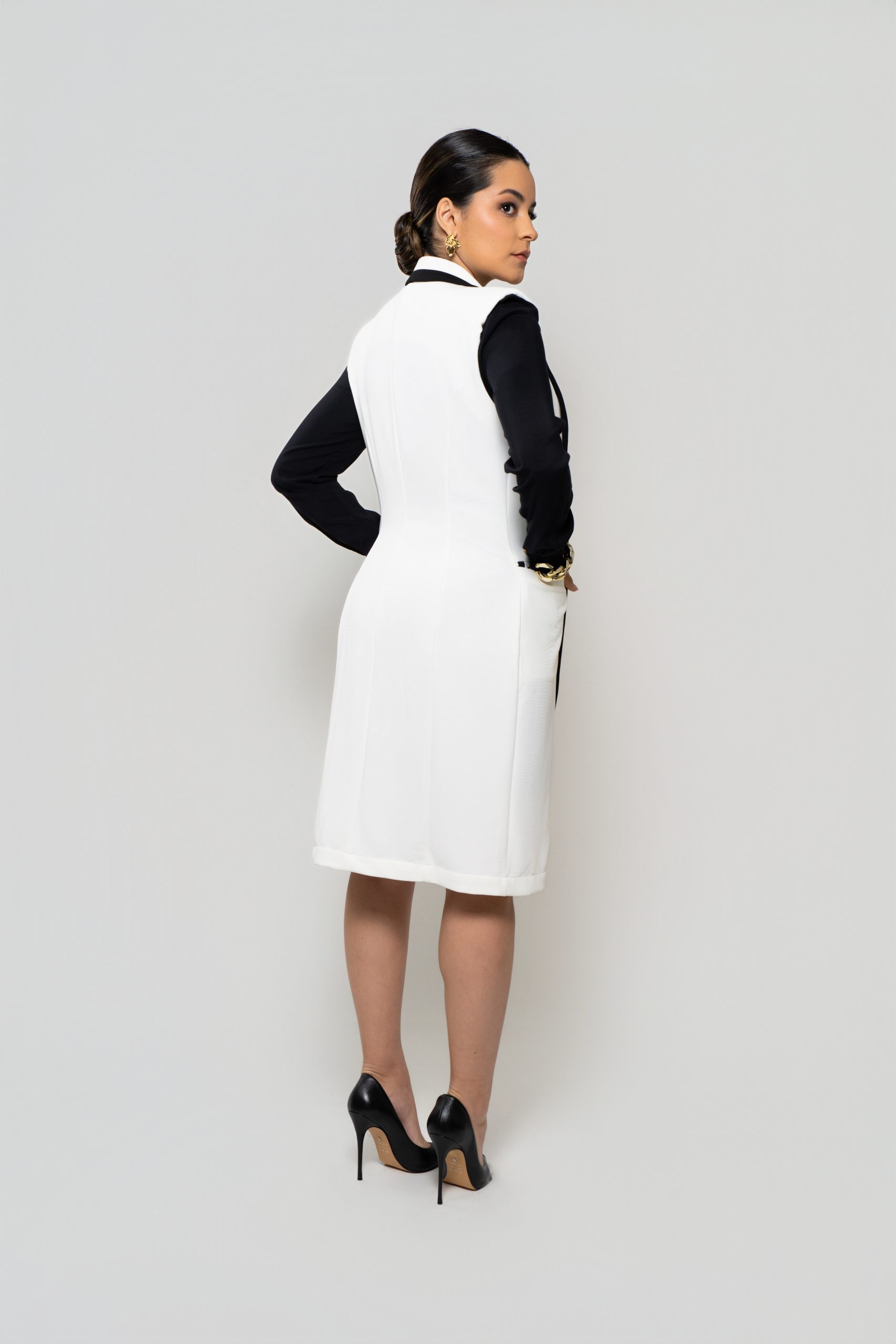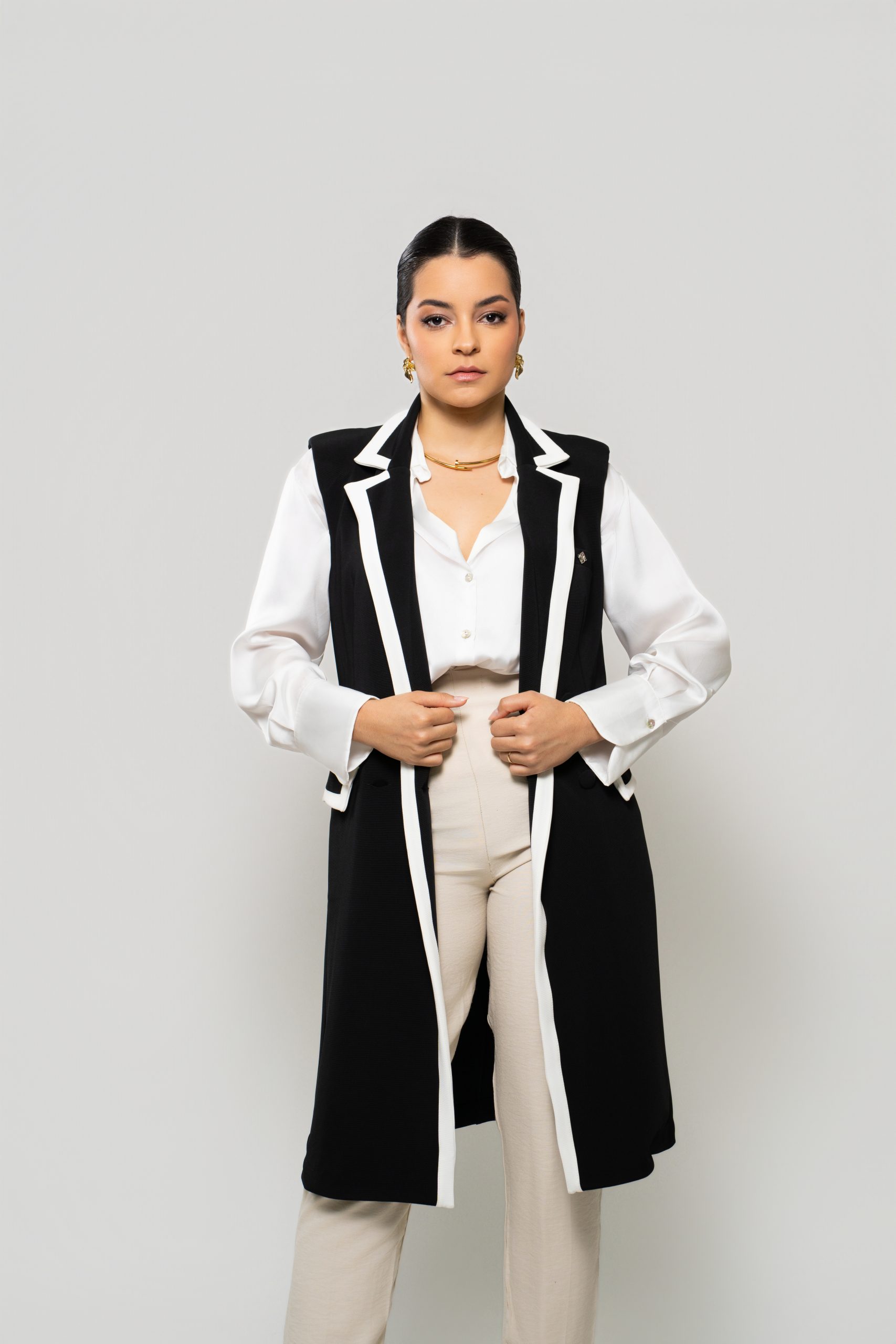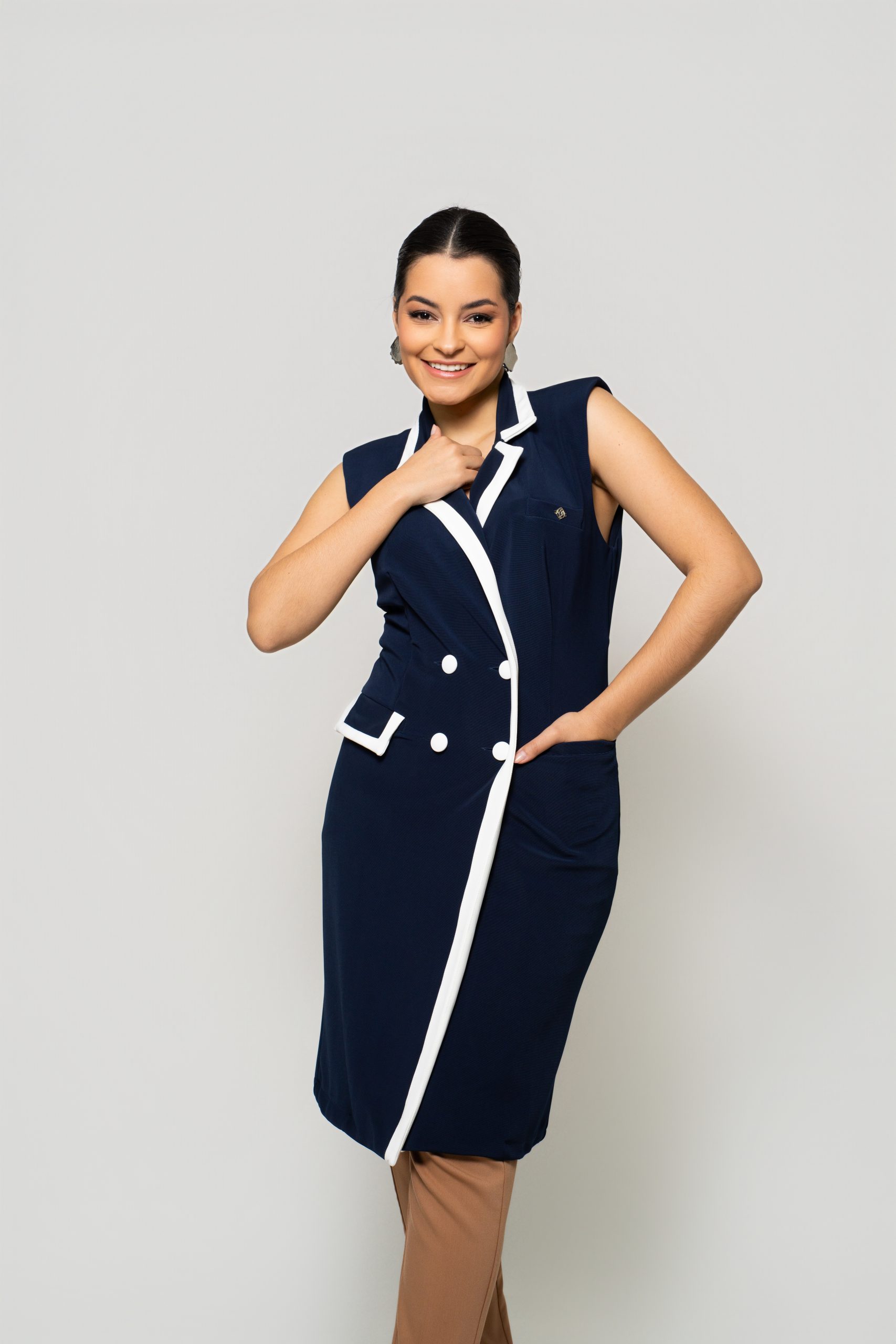 - Silhueta: Levemente acinturada e com comprimento alongado, valoriza a forma do corpo e transmite uma imagem polida e profissional.