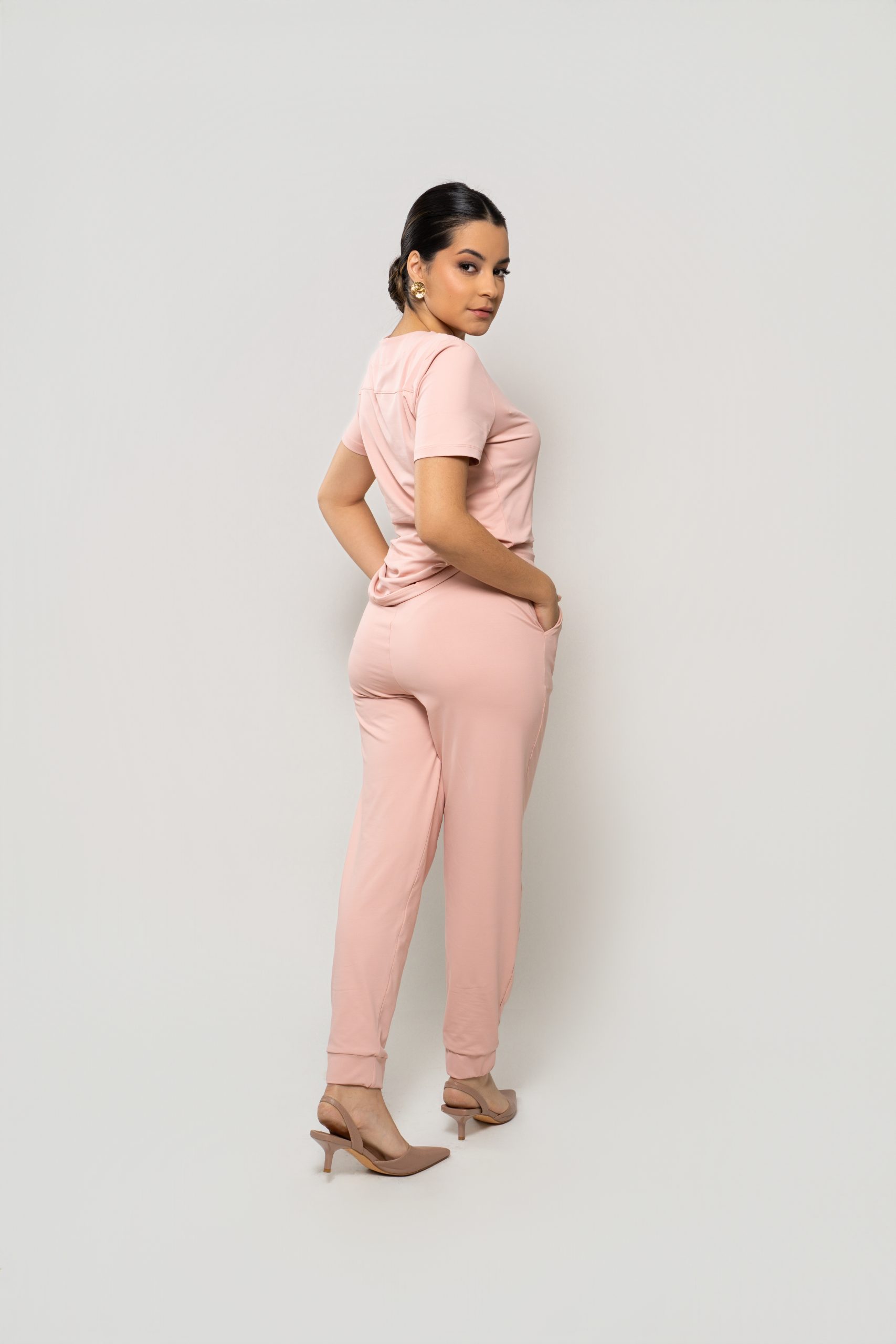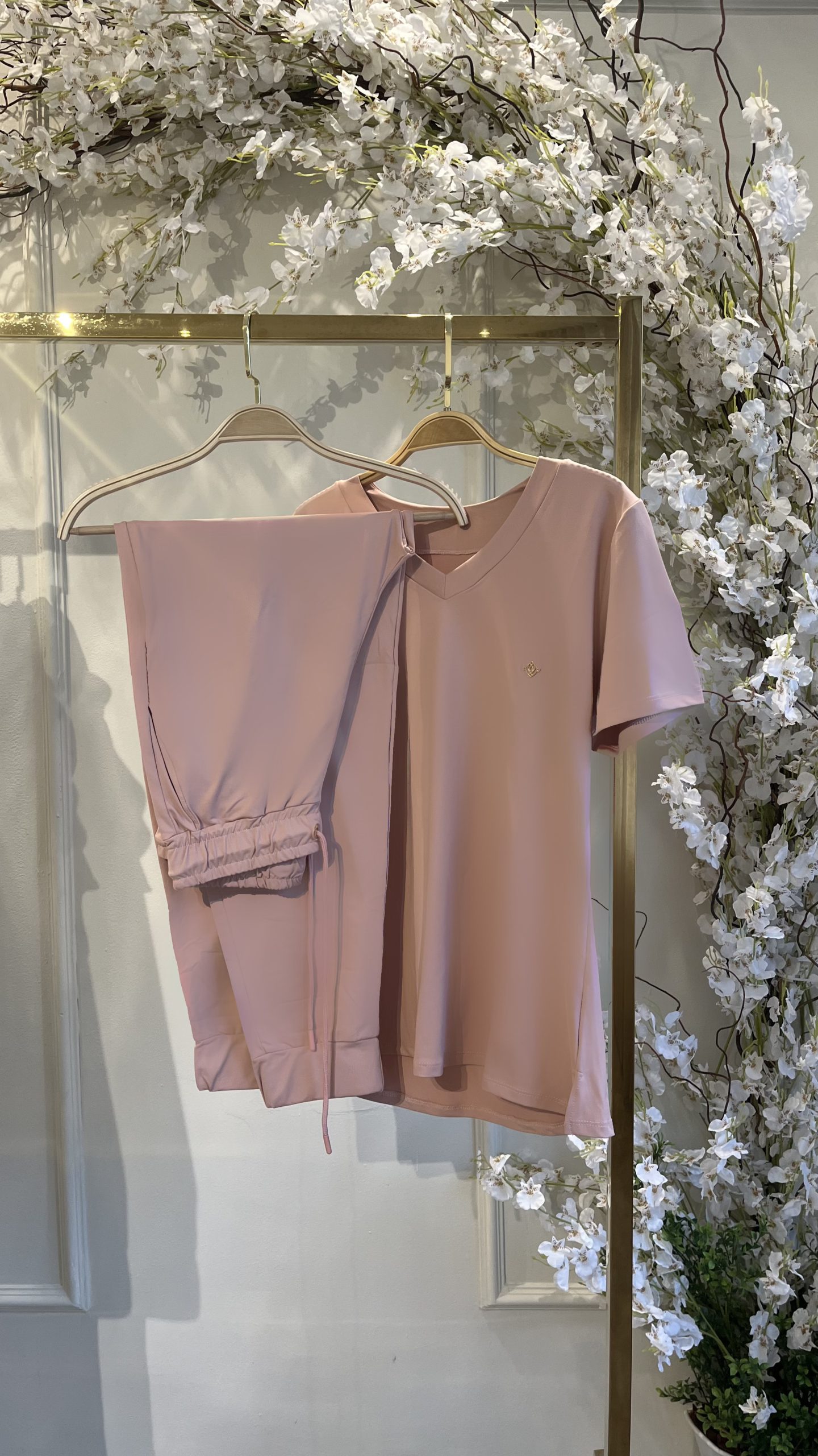 - Blusa: A blusa possui um decote em V, favorecendo o conforto e a praticidade, com um design que facilita o movimento sem restrições.